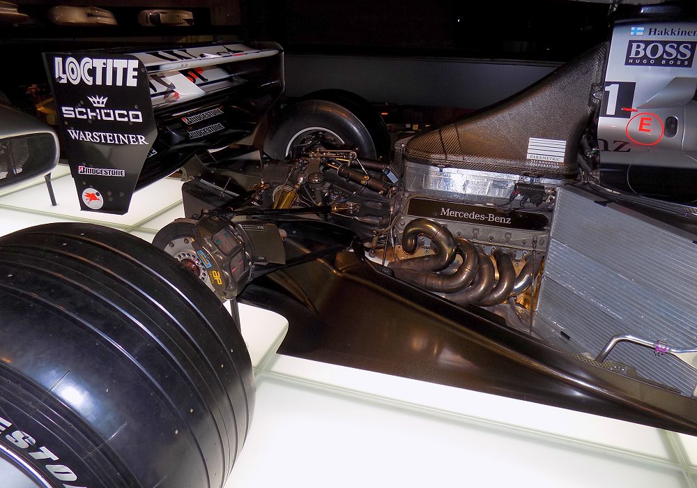Power came from the Mercedes-Benz FO110H 3.0-litre V10, developed by Ilmor as the next evolution of the FO110G used in the MP4-13. The new unit produced around 785 horsepower at peak revs, making it one of the most powerful engines on the grid. It was lighter, more responsive and more compact, designed to improve rear-end packaging and lower the centre of gravity. Although the engine was extremely fast, it was also highly stressed and contributed to several of the mechanical failures that affected McLaren’s season. When running reliably, however, it provided exceptional acceleration and top-end performance.